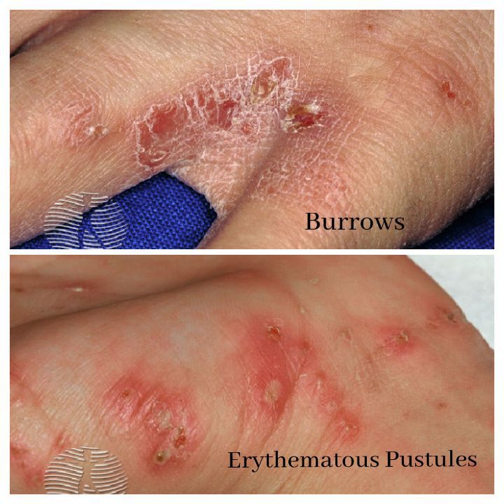 Scabies is a skin condition caused by the human itch mite, Sarcoptes scabiei. It is an extremely itchy infestation that presents with pruritic and erythematous papules along with the characteristic "burrows" in intertriginous areas. The burrows appear as irregular gray tracks and microscopic examination of it may reveal mites, mite eggs or the mite faeces. Affected infants have sterile pustules on their palms and soles and this is known as acropustulosis. It is a contagious disease and can be easily spread via skin to skin contact. This is why any individual who has come in contact with a patient needs to be examined for burrows. Factors that predispose individuals to the risk of scabies include poor hygiene, overcrowding and immune suppressed individuals. It can be treated by using topical scabicides out of which 5% permethrin cream is mostly used. Other treatment options include use of malathion lotion, precipitated Sulphur ointment or benzylbenzoate lotion. Image source: dermnetnz.org