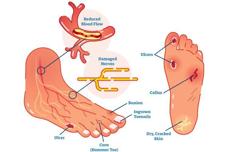 Diabetes Mellitus in long term or if not managed appropriately leads to increasing microvascular pathology and peripheral neuropathy which can lead to foot infections on a diverse spectrum. These infections include: - Superficial cellulitis - Deep skin and soft tissue infections - Acute and Chronic Osteomyelitis Text Reference: https://emedicine.medscape.com/article/237378-overview Image Reference: https://www.ausmed.com/cpd/articles/diabetic-foot-explained