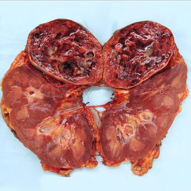 Cross section of a kidney with pheochromocytoma!! This large adrenal neoplasm has been sectioned in half along with the kidney it sits on. Note the grey-tan color of the tumor compared to a small remnant of remaining adrenal at the center. This patient had episodic hypertension and was diagnosed with a tumor arising in the chromaffin cells of the adrenal medulla - a pheochromocytoma. These are rare tumors that produce, store, and secrete catecholamines (epinephrine and norepinephrine). The condition may be fatal in undiagnosed. Extra-adrenal paragangliomas (described as extra-adrenal pheochromocytomas) are closely related, though less common. The main clinical feature is persistently high and episodic blood pressure (paroxysmal hypertension), severe pounding headache, inappropriate severe sweating, tachycardia, palpitations, and anxiety. MRI and CT scan are used for the diagnosis and tumor localization. Urine screen detects the breakdown products of the catecholamines (metanephrine, vanillylmandelic acid, etc) and plasma metanephrine levels are also useful for diagnosis. Surgical tumor resection with early ligation of venous drainage is the treatment of choice and it usually returns blood pressure to normal and reverses all other symptoms.