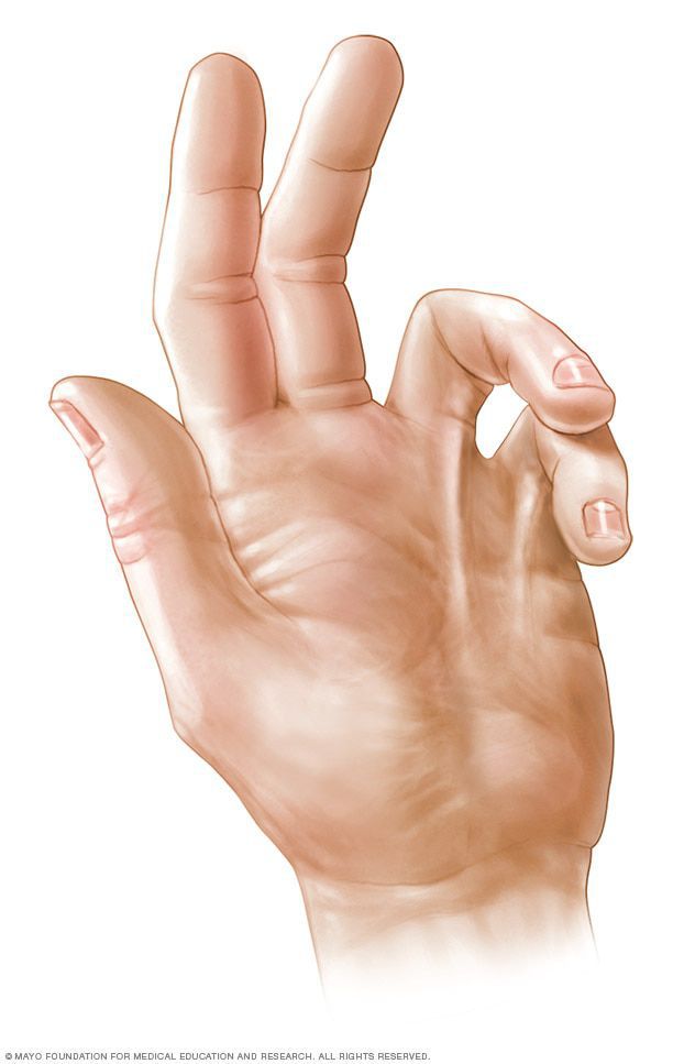 Dupuytren’s contracture results due to progressive localised thickening and tightening of the palmar fascia that results in tethering of fingers and/or thumb in a bent position. Text Reference: https://orthoinfo.aaos.org/en/diseases--conditions/dupuytrens-disease/ Image Source: https://www.mayoclinic.org/diseases-conditions/dupuytrens-contracture/symptoms-causes/syc-20371943
