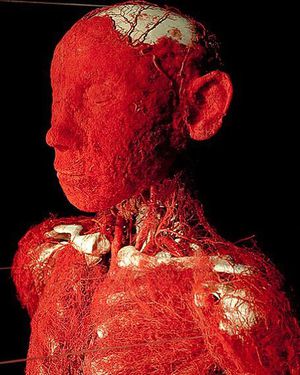 The human body stripped of fat and muscle, with just the vasculature and bony tissue preserved and exposed. Pure beauty at its finest craft.