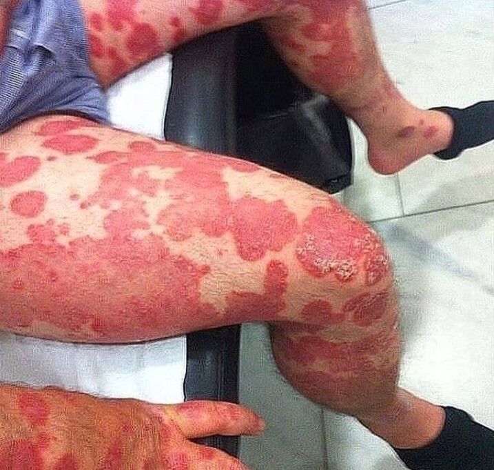 Psoriasis vulgaris is a common chronic dermatosis of unknown etiology involving neutrophils, dendritic cells, macrophages, and epidermal keratinocytes. It is also called plaque psoriasis due to characteristic plaques on the skin (well-defined patches of red raised skin).It can appear on any area of skin, but the knees, elbows, scalp, trunk and nails are the most common locations. It is characterized by hyperproliferation, inflammation of the skin, demarcated, erythematous, raised plaques with white micaceous scale. The most common form of the disease is plaque psoriasis, in which skin develops scaly, raised red lesions. The presentation of the disease is extremely variable among patients. The treatment goal for psoriasis is to help keep the condition under control. It includes : topical – creams and ointments applied directly to on the skin. phototherapy – the patient's skin is exposed to certain types of ultraviolet light. systemic – oral and injected medications that work throughout the entire body. Credits: https://www.instagram.com/p/CKpB2DyhlB_/?igshid=3z2clxqtjk45 https://www.medicinenet.com/image-collection/psoriasis_vulgaris_palms_picture/picture.htm