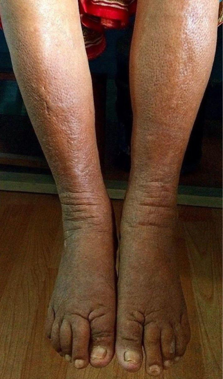 Pretibial myxedema, also known as thyroid dermopathy, has been associated with thyroid disease usually Graves disease even though it's not related to thyroid function. However, it can also occur in patients with Hashimoto's thyroiditis, primary hypothyroidism or even euthyroidism. It occurs due to deposition and accumulation of excessive glycosaminoglycans, particularly hyaluronic acid, in the dermis. It usually affects females. The most common site are the shins (pretibial areas) and dorsum of the feet. Pretibial myxedema is usually asymptomatic but the lesions may be itchy or sore. They appear swollen and lumpy and the early lesions are bilateral and firm. They may be non-pitting, asymmetrical plaques or nodules and may coalesce to form scaly, thickened and hardened skin areas. The lesions may have prominent hair follicles giving a PEAU D'ORANGE (orange peel) texture. The overlying skin may be slightly pigmented yellow-brown. The lesions may also have hyperhidrosis or hypertrichosis.