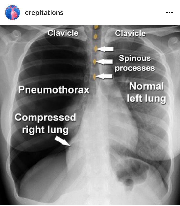 There is a large right pneumothorax (>2 cm width at the level of the hilum). The right side of the chest would be hyper-resonant to percussion.