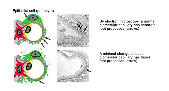 Minimal change disease is the most common cause of nephrotic syndrome in children. It is also known as lipid nephrosis. The cause is almost always unknown but it has been thought to be associated with respiratory infections, use of NSAIDS and even Hodgkins disease. The clinical picture is the same as other nephrotic syndrome with certain differences. For example, the proteinuria in minimal change disease is highly selective and there's neither hypertension nor any progression to renal failure. Moreover, the diseases shows excellent response to corticosteroids. Renal biopsy and electron microscopy of the obtained specimen helps with the diagnosis. In electron microscopy the visceral epithelial cells show diffuse effacement of foot processes. The best treatment is the use of corticosteroids.