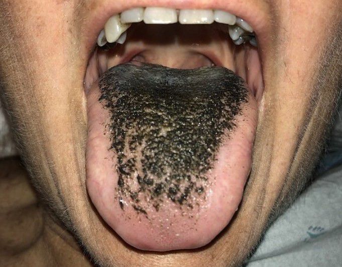 Lingua villosa Nigra or hairy tongue is a condition attributed to poor oral hygiene characterized by elongation and hypertrophy of filiform papillae. It results from abnormal desquamation of filiform papillae. The discolouration maybe due to secondary infection with porphyrin-producing chromogenic bacteria. Image by:https://www.instagram.com/p/CLWYREnh7Kc/?igshid=1bmf7fwiaxnnf