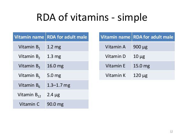 Vitamins are important micronutrients essential for proper metabolism. Since these vitamins are not produced intrinsically, it is important to acquire the required amount from external sources. The recommended daily allowance (RDA) of vitamins are given in the attached image. Source: https://www.slideshare.net/RizwanSa/vitamins-and-minerals-58807215