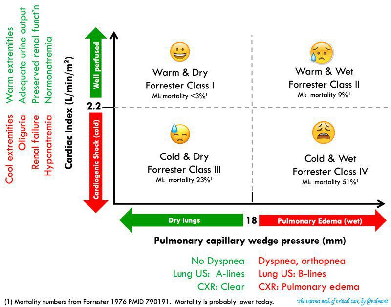 The given image provides a highly simplified algorithm in planning the basic management of congestive cardiac failure. This comes in very handy especially in the pediatric population. Warm vs cold is an indication of peripheral perfusion status while wet vs dry show the presence of pulmonary congestion. Poor perfusion needs treatment with inotropes and vasodilators while diuretics are necessary in cases who develop pulmonary edema. Image via- https://emcrit.org/ibcc/chf/