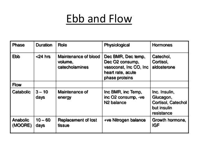 The Ebb and Flow model explains the body's metabolic response to a major stress. The initial phase is the Ebb phase which attempts to conserve the body's resources for the most important organs. A hypermetabolic phase comes next which repairs the body tissues damaged with injury. Image via: https://www.slideshare.net/sudarsanagarwal/metabolic-response-to-injury