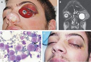 A 17-year-old boy presented with a 1-week history of proptosis of the left eye. Physical examination revealed a tumor involving the periorbital region (Panel A). Magnetic resonance imaging revealed an orbital mass (Panel B). Laboratory test results included a hemoglobin level of 89 g per liter, a platelet count of 90,000 per cubic millimeter, and a leukocyte count of 1100 per cubic millimeter. Morphologic examination of a bone marrow aspirate revealed 30% myeloblasts (Panel C, arrow). There were no circulating myeloblasts. A biopsy specimen of the orbital mass showed myeloid sarcoma. Myeloid sarcoma is a tumor composed of myeloid blasts that occurs at an extramedullary site. Myeloid sarcoma may occur on its own or concurrently with a myelodysplastic syndrome, myeloproliferative disease, or acute myeloid leukemia (AML), as seen in this case; on rare occasions, myeloid sarcoma precedes a diagnosis of AML by months or years. After the patient underwent induction chemotherapy, the mass disappeared and the eye returned to its normal position (Panel D). He subsequently underwent cord-blood transplantation, and at the 6-year follow-up, there was no evidence of recurrence of AML. Juan Montoro, M.D. Mar Tormo, M.D. Hospital Clinico Universitario, Valencia, Spain source: nejm.org