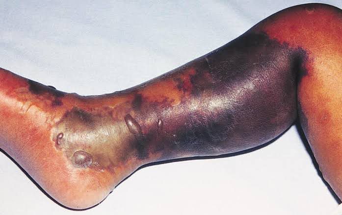 Necrotizing fasciitis is a bacterial infection of fascia along with necrosis of subcutaneous tissue. It is an aggressive infection that commonly involves Group A beta-hemolytic streptococci, Staphylococci, Anaerobes and Gram negative rods. These organisms are transmitted through surgical wounds, injuries, cuts, burns, bites and abrasions. Signs and symptoms of necrotising fasciitis includes The condition presents with fever, pain, redness and swelling of the area that progresses to cellulitis or abscess and ultimately leads to bullae formation, bleeding and necrosis of the involved tissue. Risk factors includes immune suppression, diabetes, obesity, alcoholism, intravenous drug use and malignancy. Picture credit: https://www.orthobullets.com/trauma/1007/necrotizing-fasciitis