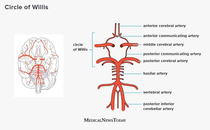 The brain is supplied by the branches of 2 arteries; vertebral artery and the internal carotid artery. The circle of willis is an anastomotic circle that supplies the cranial vault. The branches of vertebral artery are: - Anterior and Posterior Spinal arteries - Posterior Inferior Cellebellar artery - Meningeal artery The branches of Internal carotid artery: - Opthalmic artery - Posterior communicating artery - Anterior choroidal artery - Anterior cerebral artery The 2 vertebral arteries fuse together to form the Basilar artery The branches of Basilar artery: - Pontine arteries - Superior Cellebellar arteries - Posterior Cerebral arteries The circle of willis is made of: - Anterior Cerebral arteries - Internal Carotid arteries - Posterior Cerebral arteries - Anterior Communicating artery - Posterior Communicating artery Link: https://teachmeanatomy.info/neuroanatomy/vessels/arterial-supply/