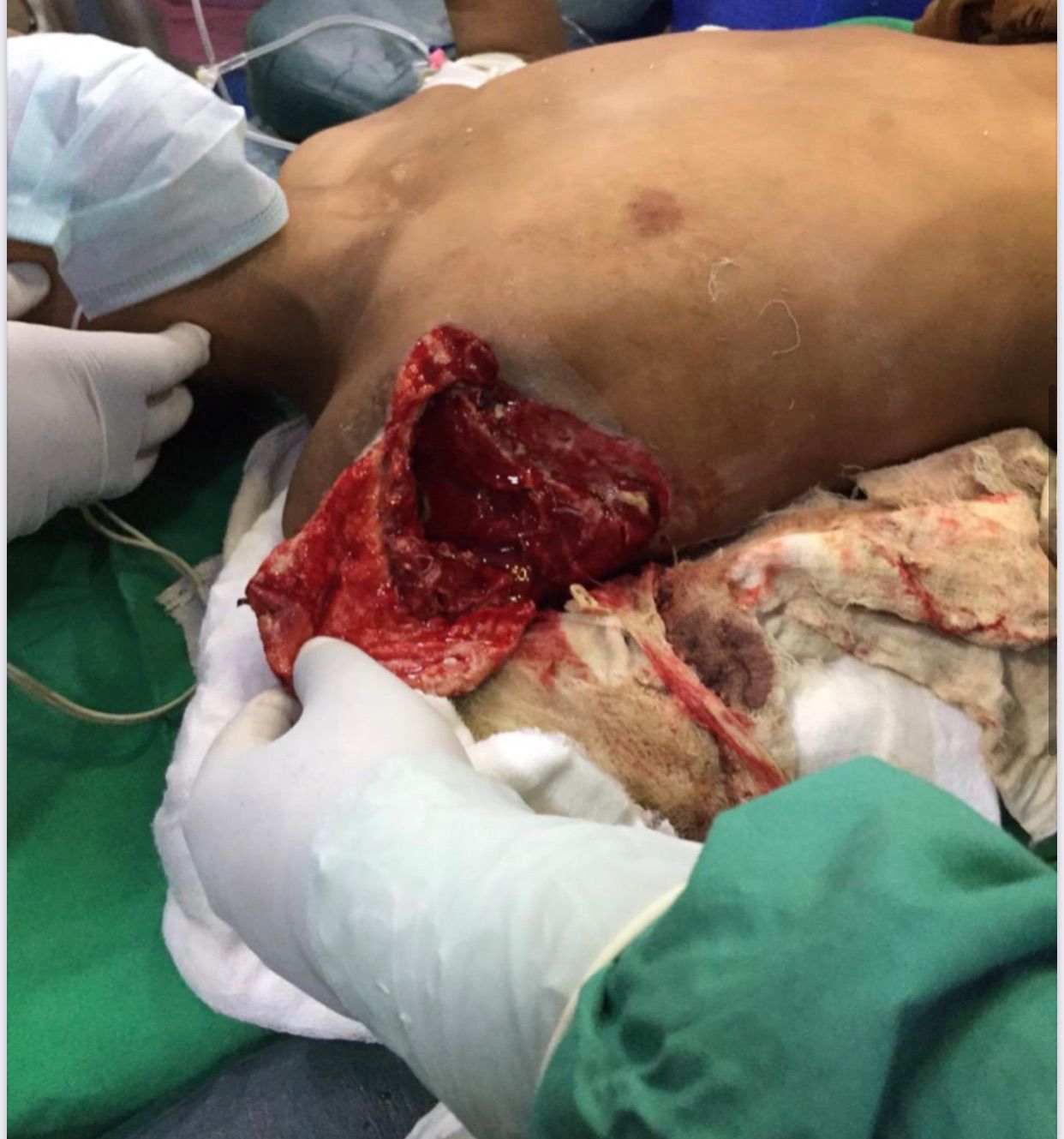 This was an electric burn of a young boy who lives in a small village and when wandering in the fields a high tension wire causes severe electric burn. Hand uptil elbow joint was severly gangrene and after forearm amputation the gangrene didn’t stop and effect the arm as well hence the amputation was done again. His shoulder girdle was left intact.