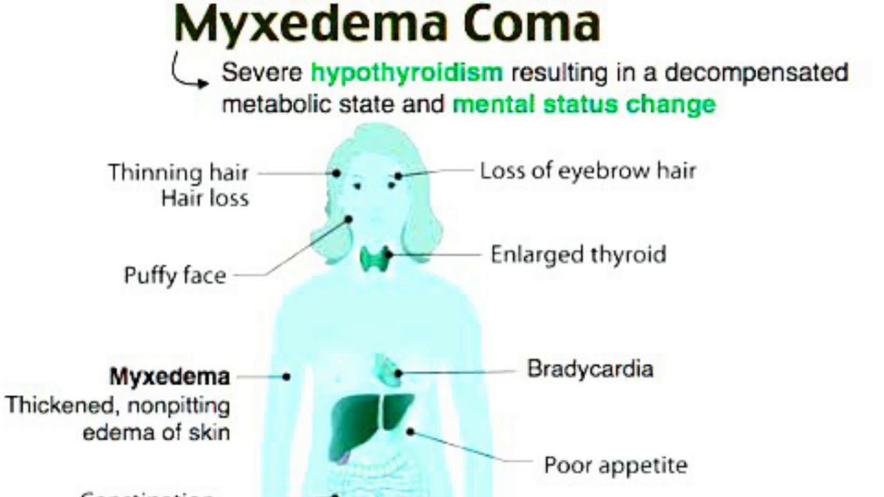 Myxedema coma is a rare condition that presents with a depressed state of consciousness, respiratory depression, and profound hypothermia. It may develop after years of severe untreated hypothyroidism. Precipitating factors include infection, trauma, cold exposure, and narcotics. It is a medical emergency, with a high mortality rate of 50%-70%, even with treatment.. Intravenous thyroxine and hydrocortisone are given to the patients while carefully monitoring the hemodynamic state. Supportive treatment is also given to maintain blood pressure and respiration.