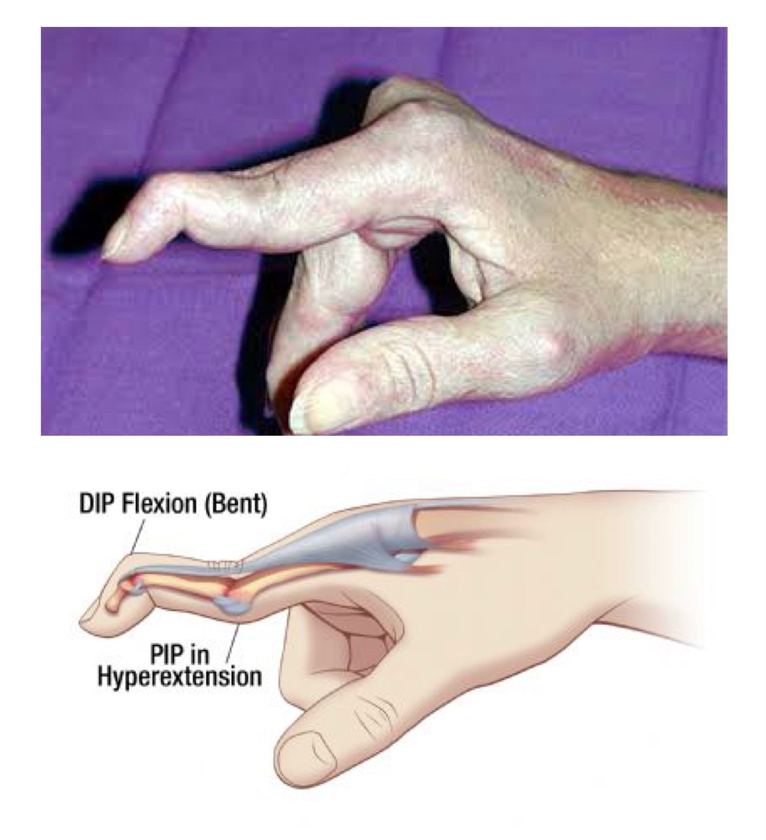 Swan neck deformity is an acquired deformity of finger characterised by flexion of distal interphalangeal (DIP) joint and hyperextention of Proximal interphalangeal (PIP) joint. This condition is a characteristic feature of the inflammatory disorder Rheumatoid arthritis. Other condition in which this condition can be seen includes Ehler-Danlos syndrome, congenital cases and I’m cases of injury. Picture credits: Above: https://www.orthobullets.com/hand/6013/swan-neck-deformity Below: https://www.physio-pedia.com/Swan-Neck_Deformity