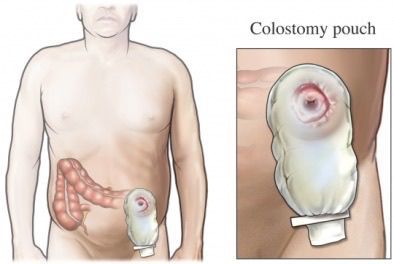 A colostomy is a surgical procedure that brings one end of the large intestine out through the abdominal wall. During this procedure, one end of the colon is diverted through an incision in the abdominal wall to create a stoma. A stoma is the opening in the skin where a pouch for collecting feces is attached. People with temporary or long-term colostomies have pouches attached to their sides where feces collect and can be easily disposed of.