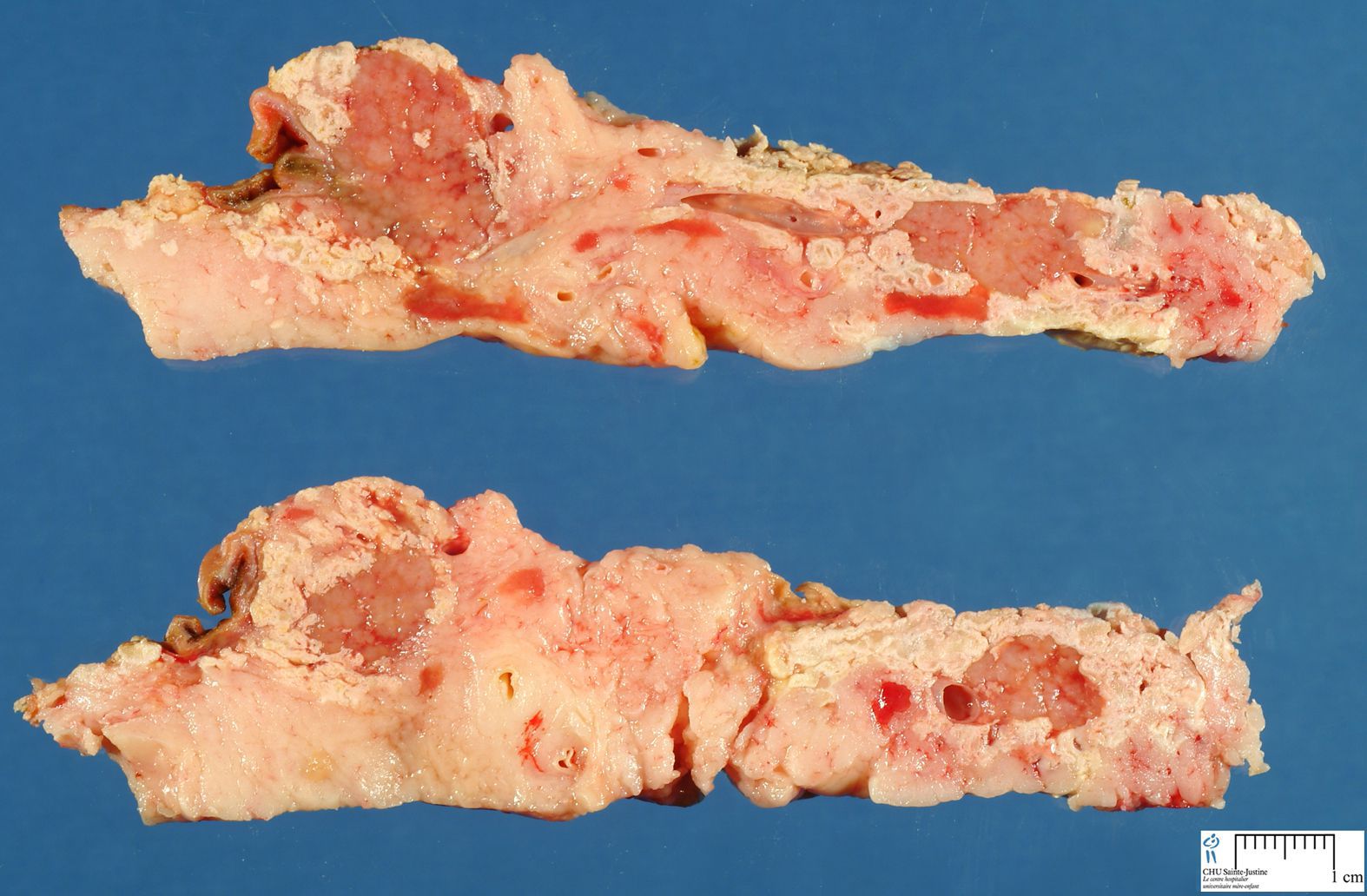 Acute inflammation of the pancreas is an exquisitely painful condition which can occur because of a variety of agents. The most common causes are gallstones and alcohol abuse. Viral infections, chemical injuries and certain metabolic derangements such as hypercalcemia are also implicated. Patients present with nausea, vomiting, fever and severe epigastric pain radiating to the back. Severe cases may also present with hypovolemic shock. There is excess release and activation of the pancreatic enzymes which result in autodigestion of body tissues. The gross specimen above shows areas of pancreatic necrosis with saponification. Calcium deposits occur on combining with fatty acids released due to excess lipase activation. Image via: https://www.humpath.com/spip.php?article6269