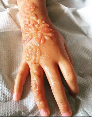 I saw this on a med post a while back ago, yea it’s a chemical henna burn, dad brought his kids to another country for vacation and had them get henna done as a surprise for her birthday, ended up burning her skin permanently like that and advised to be careful where you get your henna done.