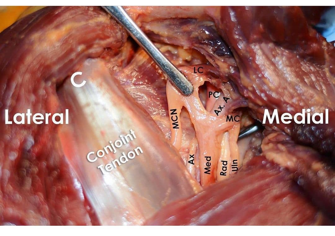 The brachial plexus is a network (plexus) of nerves (formed by the anterior rami of the lower four cervical nerves and first thoracic nerve (C5, C6, C7, C8, and T1). This plexus extends from the spinal cord, through the cervicoaxillary canal in the neck, over the first rib, and into the armpit