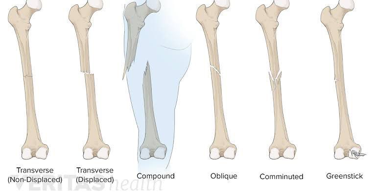 1-Transverse (non-displaced): Fractures in straight line, bone is alligned. 2-Transverse (displaced): Fractures in straight line, bone is not alligned. 3-Compound: Fractured bone and skin is not intact and is pierced by bone. 4-Obliques: Fracture in diagonal. 5-Communited: Bone is broken into more than one parts. 6-Greenstick: The broken bone is not completely separated.