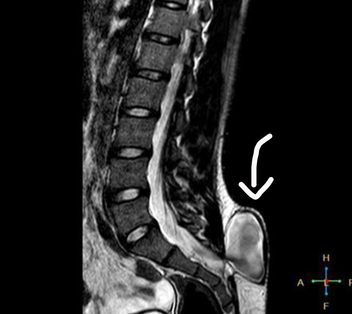 MRI depicts a relatively large case of what was diagnosed to be myelomeningocele. Early on during the development of the fetus, the ectoderm (outmost later of a fertilized egg) begins to form a ridge which will later become the neural tube. However, in spina bifida patients, this neural tube does not close properly. As a result, usually in the lumbar or sacral regions, there is an absence of a vertebral arch (composed of the spinous process, transverse process, pedicles, lamina, and the articular process). There are different forms of spina bifida for which myelomeningocele is the most severe as the spinal cord and the surrounding meninges (dura, arachnoid, pia) protrudes out of the vertebral body. Myelomeningocele is usually seen in Arnold Chiari II Malformation for which findings include obstructive hydrocephalus, myelomeningocele, corpus callosum dysgenesis, no septum pellucidum, sometimes extended cerebellum tonsils into the foramen magnum, small posterior fossa, etc. It is known that a Vitamin B9 deficiency during the development of the fetus is a risk factor for spina bifida. Now, as for diagnosis of spina bifida, one must look for elevated alpha fetoprotein. Furthermore, as with ordered blood tests, one must look for estriol, inhibin A, and human chorionic gonadotropin. All these tests are usually accompanied with an ultrasound.