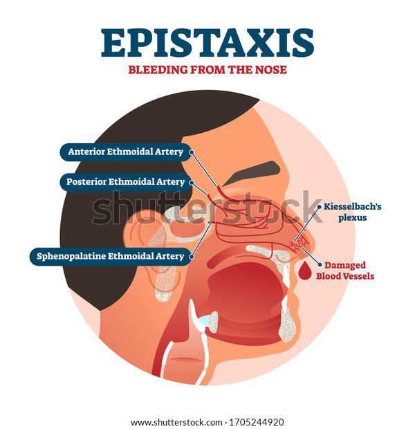 Epistaxis refers to bleeding from the inside of the nose. Bleeding may occur from any side but in 90% of the cases, it occurs from Little's area which is situated in the anteroinferior part of the nasal septum. In Little's area anastomosis of four blood vessels is present, called Kiesselbach's plexus. These vessels include anterior ethmoidal artery, septal branch of superior labial artery, sphenopalatine artery, and greater palatine arteries.