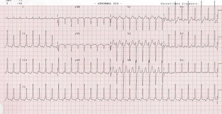 A 34 year old male landed in a hypotensive state in the ER after having a road traffic accident. On examination, he had bruises over his thorax and a closed fracture of the radius and ulna. Resuscitation was initiated and ECG leads were attached. What does the following pattern indicate?