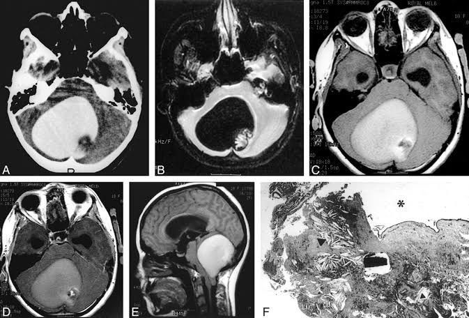 A dermoid cyst is a developmental anomaly characterized by a saclike growth that is present at birth. It grows slowly and are not tender unless ruptured. It may contain structures such as hair, fluid, teeth and usually occur on the face, inside the skull, on the lower back, and in the ovaries. Dermoid cysts account for ~0.5% of all primary intracranial tumors and are slightly more common in females. Intracranially, they are typically located in the midline and grow towards one side or the other. Locations include: midline sellar and suprasellar parasellar frontonasal region posterior fossa/vermis Credits : https://radiopaedia.org/articles/intracranial-dermoid-cyst-1 http://www.ajnr.org/content/22/10/1970