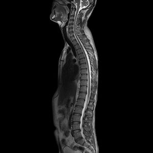 Whole spine T2 PROPELLER Sagittal. GE Discovery MR750w 3.0 Tesla. Courtesy of @gehealthcare