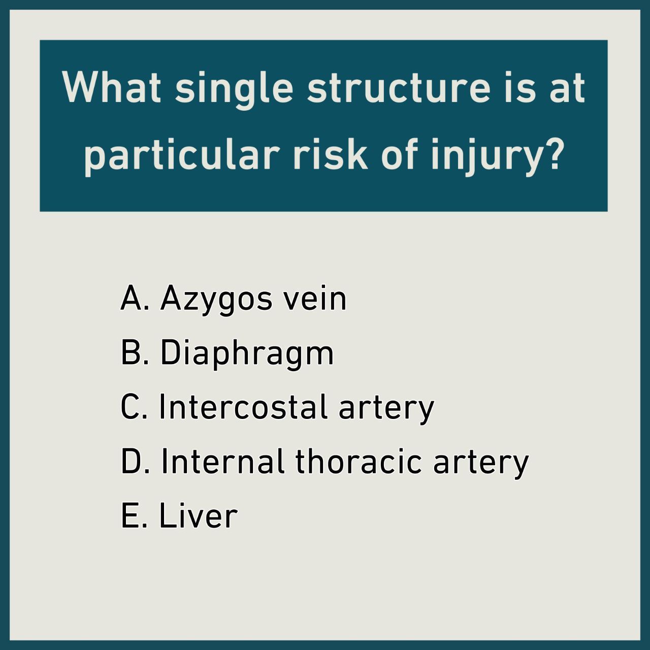 ✅The correct answer is: C. Intercostal artery. ⚠️Most vulnerable structure is intercostal nerve, then intercostal artery then intercostal vein. 💡As intercostal nerve is not in the options, intercostal artery is the answer here.