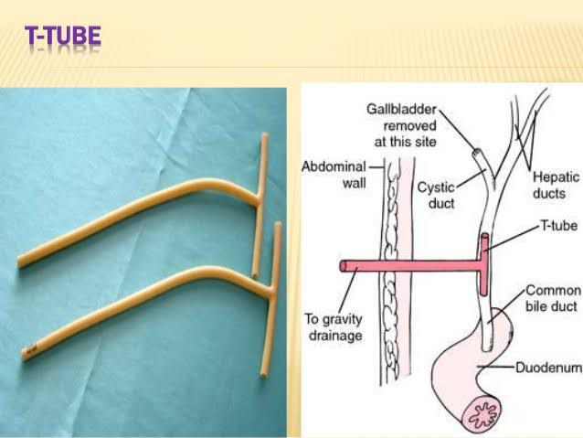T tube is a tube shaped like a T, the top of which is placed within a tubular structure such as the common bile duct and the stem placed through the skin; used for decompression.
