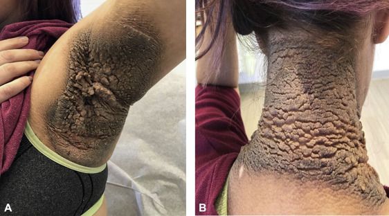 It is a condition in which there is darkening of skin in the body folds and creases. Some of the causes of acanthosis nigricans are obesity,type 2 diabetes, Cushing's syndrome and PCOS.