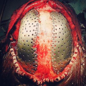 Metal skull, with screw inserted? This is a procedure called cranioplasty. Cranioplasty is the repair of a skull vault defect by insertion of an object (bone or nonbiological materials such as metal or plastic plates), is a well-known procedure in modern neurosurgery. Brain protection and cosmetic aspects are the major indications of cranioplasty. Mention your friends & follow us @medshots
