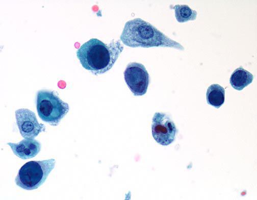 Presence of Decoy Cells in urine cytology may indicate human polyomavirus. This is one of the indicator that aid for diagnosis of this particular virus. Characteristically, polyomaviridea are relatively small and double stranded virus, which causes human polyomavirus. Image above shows the morphological structure of "decoy cells" with a very high N:C ratio and prominent intra nuclear inclusions. These cells may also exhibit a comet-liked cytoplasm. Photo Credited to: http://pathology.jhu.edu/cytopath/masterclass/urine/benign/1uri14.htm