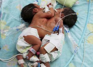 Conjoined twins type - Thoraco-omphalopagus (28% of cases): Two bodies fused from the upper chest to the lower chest. These twins usually share a heart, and may also share the liver or part of the digestive system. There are two theories about the development of conjoined twins. The first is that a single fertilized egg does not fully split during the process of forming identical twins. The second theory is that a fusion of two fertilized eggs occurs earlier in development. Although conjoined twinning has not been linked to any environmental or genetic cause, they occur so rarely it has not been possible to draw firm conclusions.