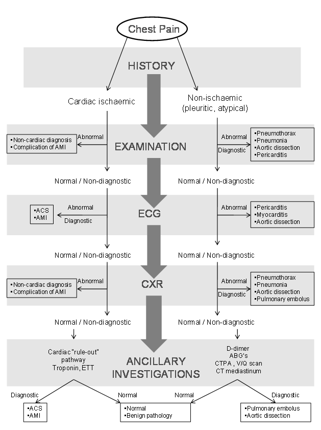 The above attached image shows a simplified algorithm that explains the approach that can be taken in emergency and non-emergency setting to diagnose the cause of chest pain and what differentials are to be kept in mind. Happy Learning! Image Source: https://www.rcemlearning.co.uk/reference/chest-pain-syndromes/#1568645272466-3fa80523-f31a