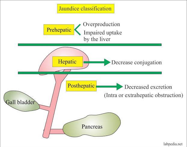 There are three types of jaundice: Prehepatic: common cause is hemolytic anemia. Hepatic: due to cirrohsis of liver or viral hepatitis. Posthepatic: due to obstruction either intrahepatic or extrahepatic for example stones in the gall bladder or carcinoma in head of pancreas.