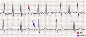 is the most common cardiac arrhythmia (heart rhythm disorder). It may cause no symptoms, but it is often associated with palpitations, fainting, chest pain, or congestive heart failure. However, in some people atrial fibrillation is caused by otherwise idiopathic or benign conditions. The incidence and prevalence of AF is increasing and lifetime risk over the age of 40 years is ~25%. ECG Features of Atrial Fibrillation: • Irregularly irregular rhythm. • No P waves. • Absence of an isoelectric baseline. • Variable ventricular rate. • QRS complexes usually < 120 ms unless pre-existing bundle branch block, accessory pathway, or rate related aberrant conduction. • Fibrillatory waves may be present and can be either fine (amplitude < 0.5mm) or coarse (amplitude >0.5mm). • Fibrillatory waves may mimic P waves leading to misdiagnosis. *🔴🔵 Arrows show the changes of P wave between the Atrial Fibrillation and normal sinus rhythm.