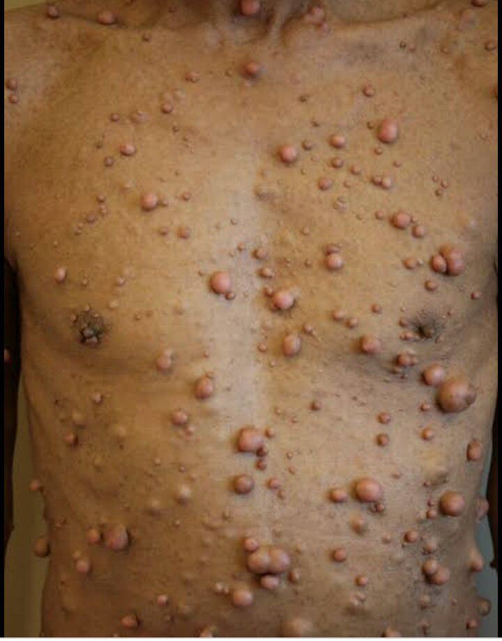 Its a genetic condition which effects the bone, soft tissue, skin and nervous system. Clinical manifestation increase over time. Its has two distinct types, NF1 and NF2. NF1 presents with flat brown birthmarks, freckling in skin folds and multiple tumours that hang off the skin. NF2 occurs 1 in 50,000 births. Its also known as bilateral acoustic neurofibromatosis. It is characterized by multiple lesions on brain and spinal cord. It occurs due to gene mutation on chromosome 17 and 22 respectively. There is no known cure of NF. Lesions or tumours that become large and painful can be cut out surgically to reduce the risk of malignancy.