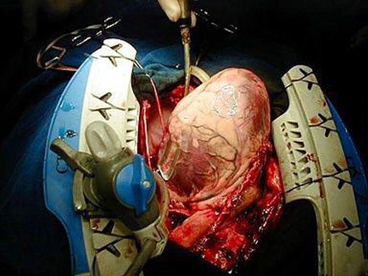 Ectopia cordis is defined as a complete or partial displacement of the heart outside the thoracic cavity. It could be total or partial depending on the amount of the cardiac volume presenting outside the thoracic cavity. As we have mentioned in our previous case, the heart has been repaired and replaced back into the thoracic cavity. A coronary stabilizer has been installed on the marginal branch of the circumflex artery. There is a graft between the left internal thoracic artery and the anterior interventricular artery. The polyester strip is visible, with traction applied in the direction of the patient's transverse axis. Also visible is the suture thread, with traction applied in the direction of the patient's longitudinal axis. A pericardial replacement membrane of 0.1 mm was used to repair the pericardial defect and was fixed in a way so as to keep the heart in place. The lower three costal cartilages attached to the bifid sternum were dislocated from their costochondral junction and were deviated medially and fixed in place to protect the heart.