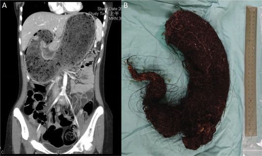 A 16 years old girl with a past history of tricophagia and microcytic anemia was presented with anorexia, vomiting, and weight loss for 2 months. On examining her abdomen, a large non-tender mass was palpable in the left upper quadrant. Abdominal CT showed large amounts of mottled material in the stomach, presumed to be a bezoar. On anterior gastrotomy, a trichobezoar was seen completely filling the stomach and extending into the duodenum. Upon histopathological examination, it was found to be a hairball containing food residue. Surgical excision of the bezoar was done and the patient was referred to the psychiatry department. A bezoar is a collection of non-digestible materials in the stomach or intestine. A trichobezoar refers to hairballs in the stomach, almost exclusively found in young female psychiatric patients. Most of the cases are asymptomatic until the mass reaches a size large enough to cause symptoms. If left untreated, it can cause perforation, gastric ulcers, and even death. Diagnosis is made by abdominal ultrasound and CT scan. Conventional laparotomy is the treatment of choice. Reference: https://www.pediatr-neonatol.com/article/S1875-9572%2819%2930520-0/fulltext