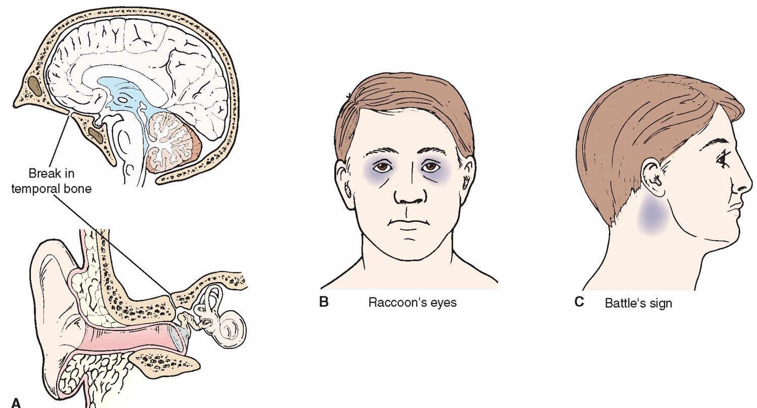 1.Racoon's eyes (periorbital bruise) 2.battle's sign (retroauricular or mastoid ecchymosis)