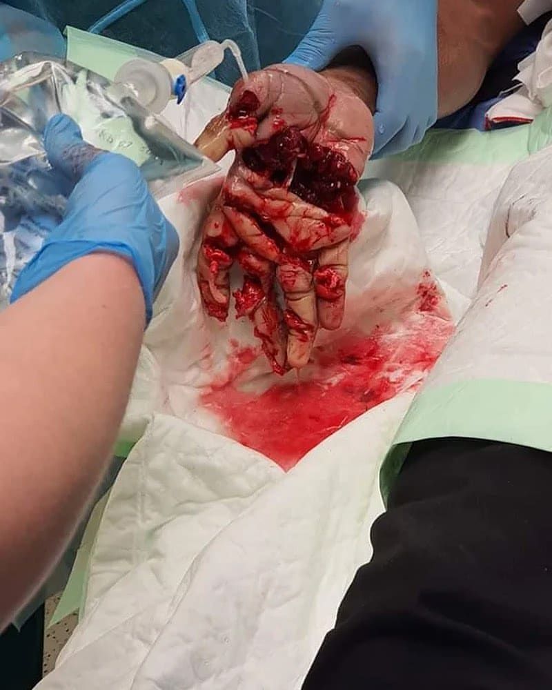 A 42 year-old male presented to the emergency department via EMS with a laceration extending across the palm and through the full thickness of the hand. This patient had his hand stuck in a meat grinder and almost lost the entire hand. How would you treat this patient if they arrived in your emergency department? Credit: @themedicalmentors