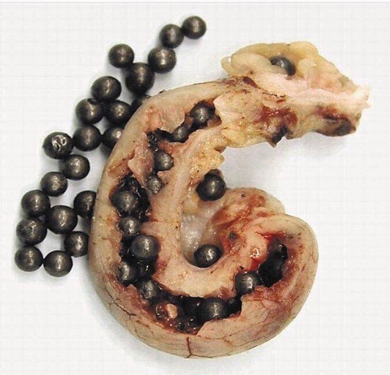 An 8-year-old hyperactive boy was admitted to the hospital after having been found to have elevated blood lead levels, ranging from 17.4 to 27.4 μg per deciliter (reference range, <10) over a period of 2 years. An abdominal radiograph revealed large numbers of small, hyperdense foci in the right lower quadrant. The entire family reported that they regularly ate geese that were killed with lead pellets from a shotgun, and the children reported that they had been eating the pellets as part of a game to make them disappear. The patient and his siblings underwent bowel washout. A follow-up radiograph of the patient revealed that pellets were still present in the gastrointestinal tract, in either the cecum or the appendix. Laparoscopic appendectomy was performed. The appendix weighed 27.5 g (normal weight, 4 to 5 g), measured 55 mm in length, and had an average external diameter of 7 mm with a wall thickness of 2 mm. A total of 57 lead pellets were recovered from the lumen. Microscopical examination of the appendix showed minor changes with a focus of submucosal calcification and fibrosis. No acute inflammation was observed. 📷•Medicogram