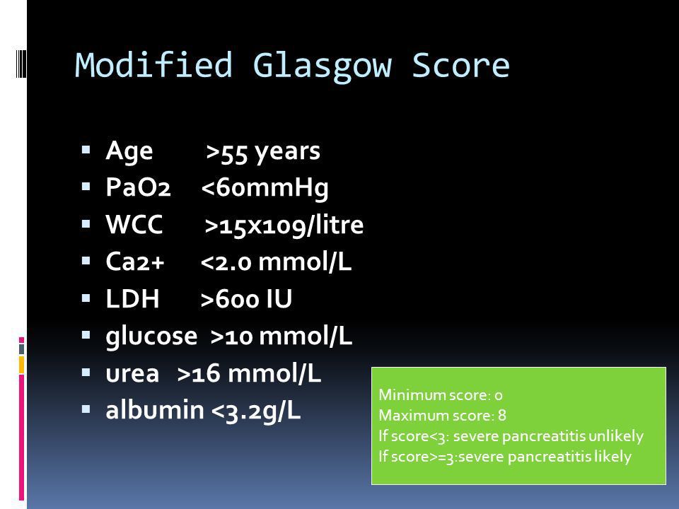 Glasgow Imrie Severity Score is used after 48 hours of admission in the hospital in order to stratify the risk of complications in acute pancreatitis. Multiple factors are considered to identify the risk. Reference: https://www.mdcalc.com/glasgow-imrie-criteria-severity-acute-pancreatitis#why-use