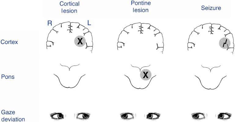 If midbrain is affected espcially in trauma it is either affected in Neucleus of of CN3 so it will cause ipsilateral conjugate movement toward side of lesion Or affect fibers either somatic causing deviation down and out Or parasympathtic causing dilated fixed pupils In pons : miosis is the role and contralateral gaze deviation