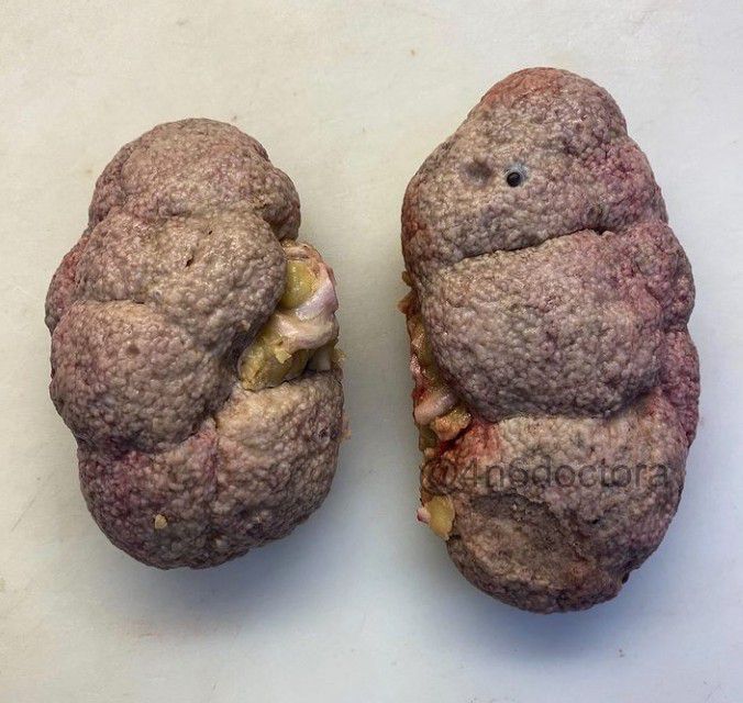 Occasionally autopsy is performed on a body that has already gone for embalming process in a funeral home. Gases and fluids are drained from the body and replaced by chemicals that preserve the organs. These Kidneys are pale and hardened as a result of embalming process and have a granular texture from a Kidney Disease. By: https://www.instagram.com/p/CDwEbVKDCbw/?utm_medium=copy_link