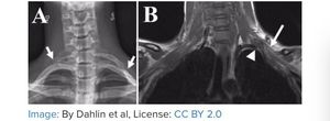 A 16-year-old teenage patient comes to the clinic complaining of episodes of sharp pain in her left upper limb. The pain started gradually a few months ago and has become progressively worse, especially after physical activity. She describes her pain as βsomeone stabbing me in my arm and then the pain moves down to my handβ. She is also complaining of some vision problems in her left eye. Her vital signs are normal. On physical exam she is normal in posture and her appearance is appropriate with her age. Both of her upper limbs are symmetrical. Palpation of her left upper limb shows tenderness mainly near hear neck. A mild ptosis is noticed on her left eyelid with anisocoria of her left pupil measuring 1 mm smaller than the right pupil. The right upper limb is normal. An X-ray and an MRI are ordered (shown in the exhibit). A. Numbness over her left thumb B. Numbness over the dorsum of her left hand C. Numbness over her index finger D. Numbness over her left little finger