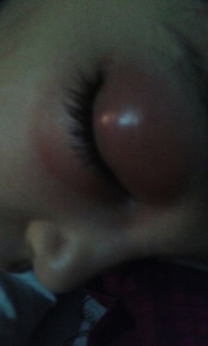 Bug or spider bite that needs treated sooner than later! If a bug bite can be ruled out then I would lean towards a infected duct or tear gland either way I wouldn't leave this untreated due to it's close location to the brain