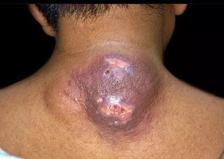A group of boils with puss filled bumps caused by streptococcus aureus. Usually occur on the nape of neck,shoulder,buttock,thigh,arm pit. Complications may lead to toxaemia,Gangrene,necrosis,septicemia. Treatments are drainage of pus and intake of antibiotics.